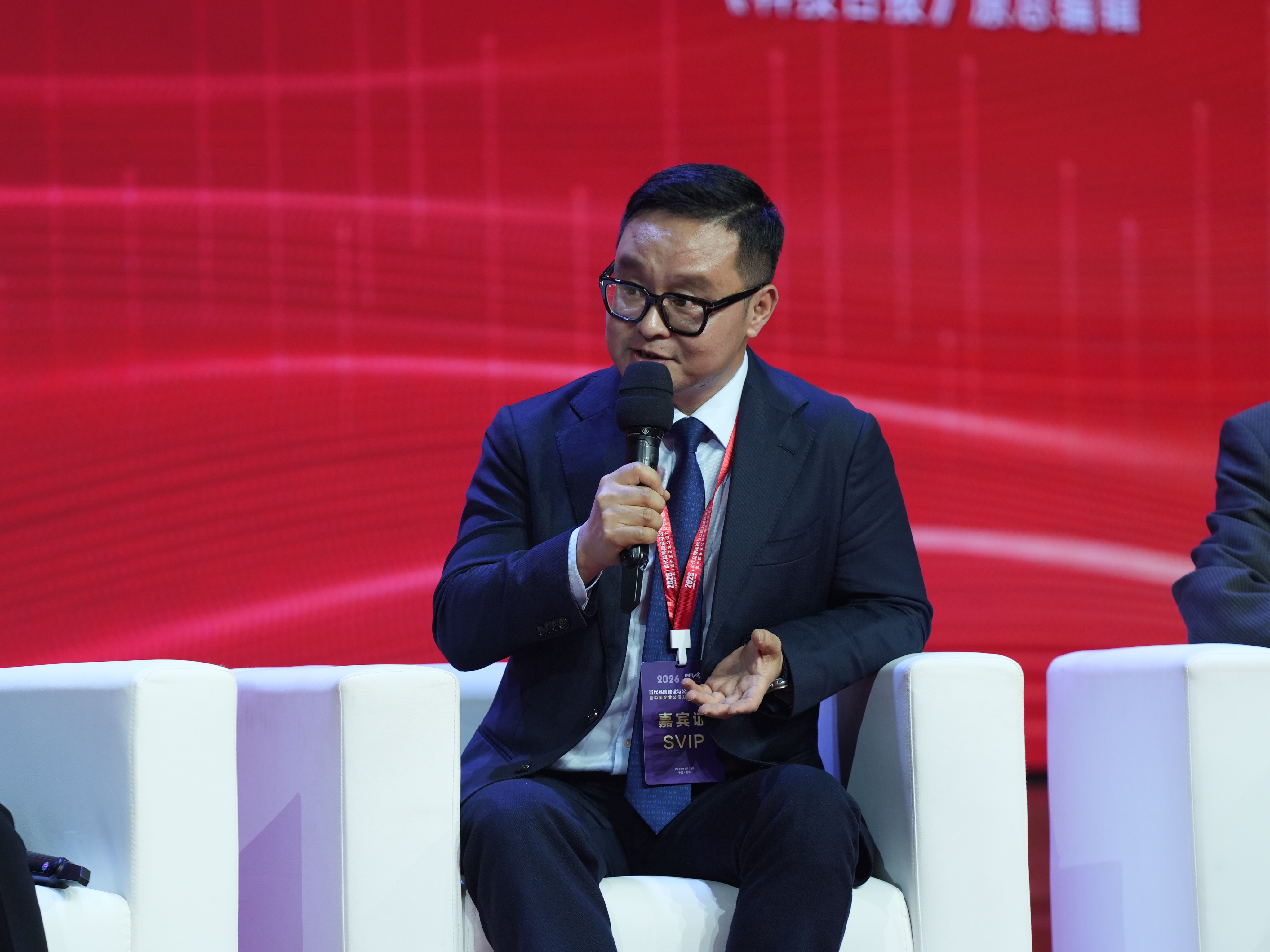 2026年3月22日,当代品牌建设与公信力提升论坛现场,润宝物流董事长杨志翔与著名主持人水均益及各界企业家,共话科技创新与工业品牌如何构建企业公信力。